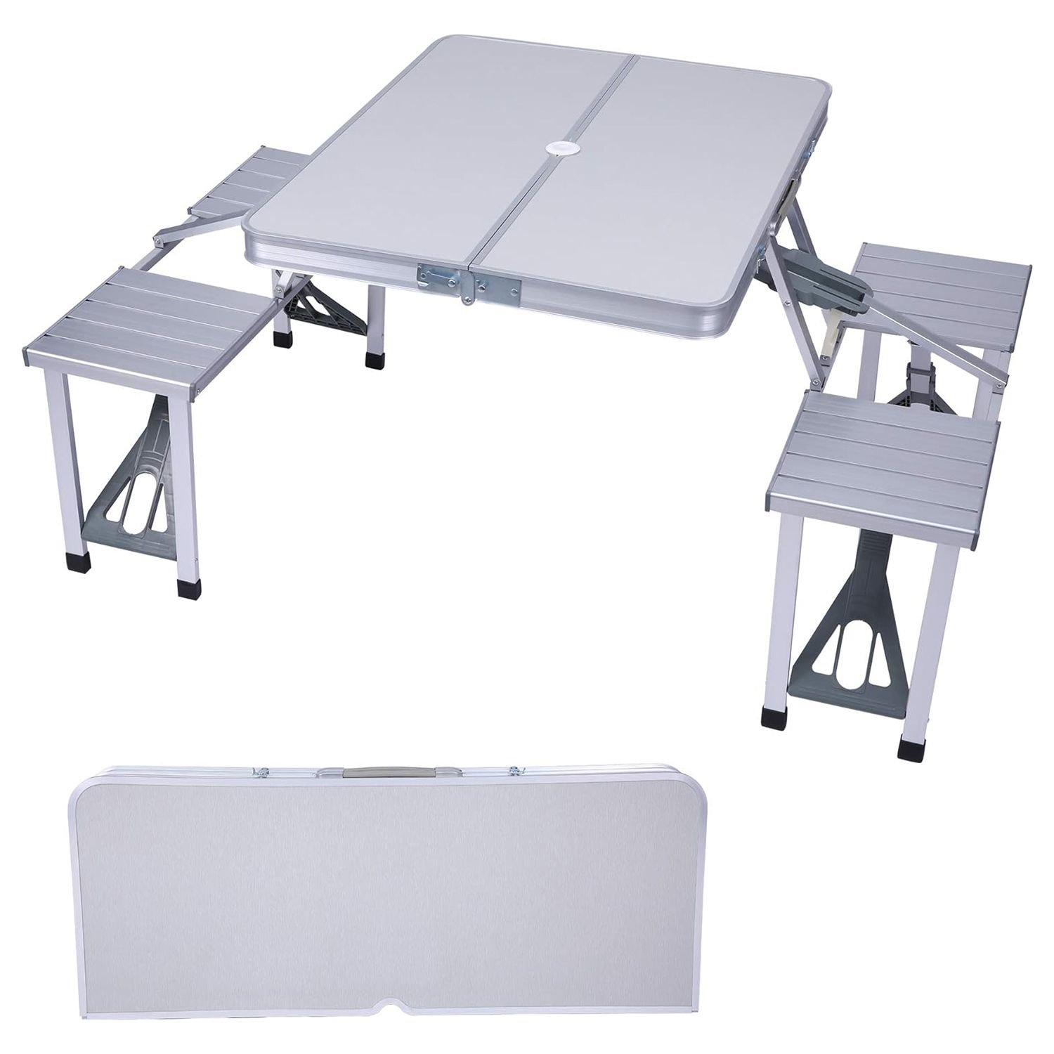 1.Foldable aluminum alloy picnic table can save space and time as well as convenient to transport and store. Make your next picnic a breeze with this easy set up and take down portable, folding picnic table with 4 seats. The table can hold up to 50lbs. It measures 33.5''x26.4''x25.9'' with a built in